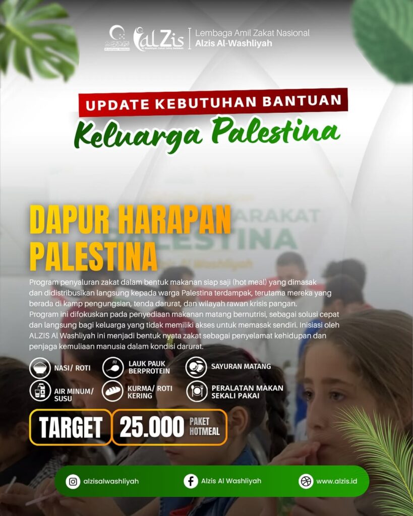 Program Dapur Harapan Palestina yang digagas oleh LAZNAS Alzis Al Washliyah merupakan bentuk kepedulian nyata terhadap krisis kemanusiaan di tanah suci tersebut. Melalui program ini, ribuan paket makanan siap saji (Hot Meal) yang bergizi disalurkan langsung kepada keluarga di zona pengungsian dan daerah terdampak konflik. Setiap paket berisi nasi atau roti, sayuran, sumber protein, serta air minum dan susu sebagai tambahan nutrisi penting.