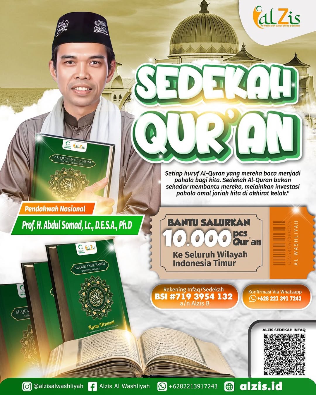 Melalui program Sedekah Al-Qur’an, Lembaga Amil Zakat (LAZ) Alzis Al Washliyah berkomitmen untuk terus menjadi jembatan kebaikan antara para donatur dan penerima manfaat. Setiap mushaf yang dibaca akan menghadirkan pahala yang terus mengalir kepada para donatur, sehingga kebaikan yang ditanamkan akan senantiasa hidup meski waktu terus berjalan.